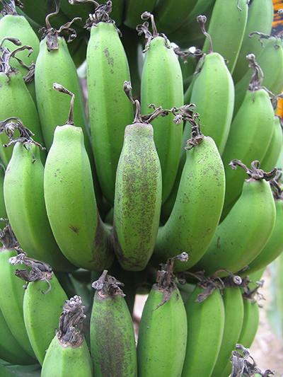 Solution: Lady Finger and Ducasse are more prone to sooty blotch than Cavendish-type bananas. A post-harvest dip of sodium hypochlorite at 100 ppm for 5 minutes followed by immediate rinsing, is highly effective in removing sooty blotch.